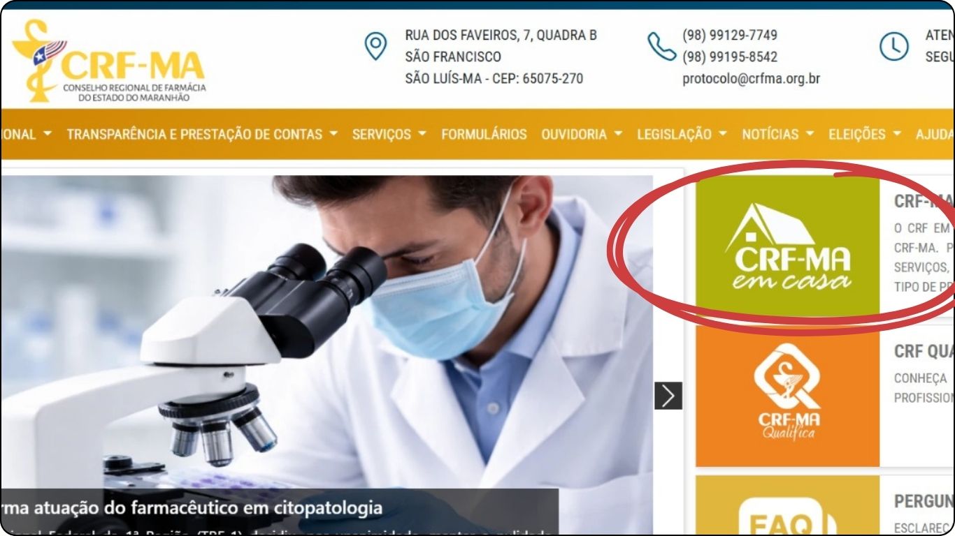 1.Acesse o site do CRF-MA e clique na aba "CRF-MA EM CASA"